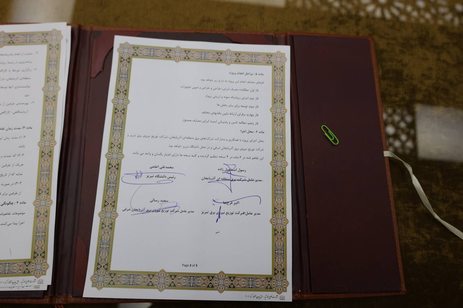 در آیین امضای این تفاهمنامه که پیش از ظهر روز شنبه ۲۵ اسفند ماه در محل دانشگاه تبریز انجام پذیرفت، رسول اسماعیلزاده مدیرعامل شرکت برق منطقهای آذربایجان، سعید رسالی مدیرعامل شرکت توزیع نیروی برق آذربایجانشرقی و اکبر فرج نیا مدیرعامل شرکت توزیع نیروی برق تبریز از یک سو و محمدتقی اعلمی رئیس دانشگاه تبریز از سوی دیگر اقدام به امضای این تفاهمنامه چهارجانبه کردند.