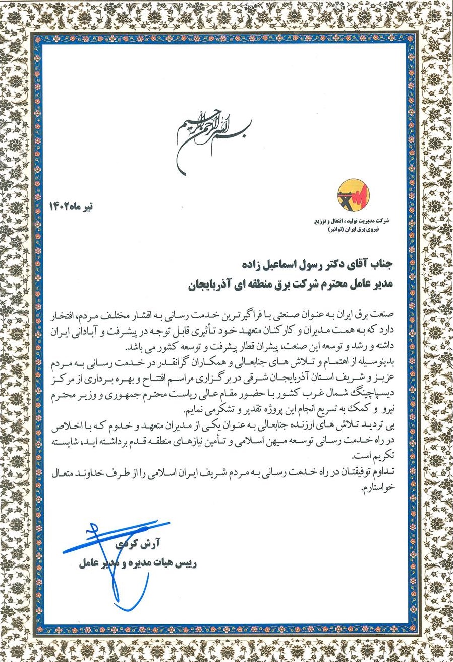 مهندس کردی در این لوح تقدیر، رشد و توسعه صنعت برق را پیش ران قطار پیشرفت و توسعه کشور دانسته و ضمن قدردانی صمیمانه از تلاشهای ارزنده دکتر اسماعیل زاده مدیرعامل شرکت برق منطقه ای آذربایجان، وی را به عنوان یکی از مدیران متعهد، خدوم و با اخلاص صنعت برق کشور و شایسته تکریم دانسته که در راه خدمت رسانی به توسعه میهن اسلامی و تامین نیازهای منطقه، قدمهای موثری برداشته است.
