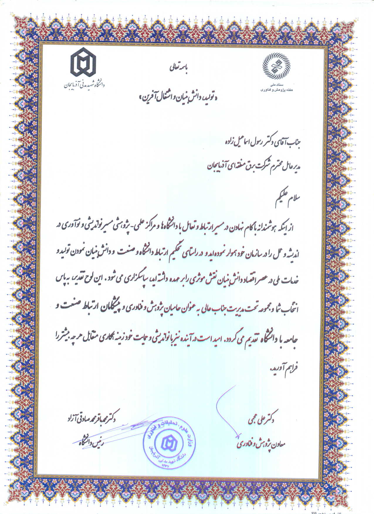 در مراسمی که به مناسبت هفته پژوهش و فن آوری برگزار گردید ، دکتر محمد صادقی رییس دانشگاه شهید مدنی تبریز با اعطای لوح تقدیر به دکتر رسول اسماعیل زاده مدیرعامل شرکت برق منطقه ای آذربایجان از انتخاب ایشان و مجموعه شرکت باعنوان حامیان پژوهش و فن آوری و پیشگامان ارتباط صنعت و جامعه با دانشگاه تقدیر و تشکر کرد.