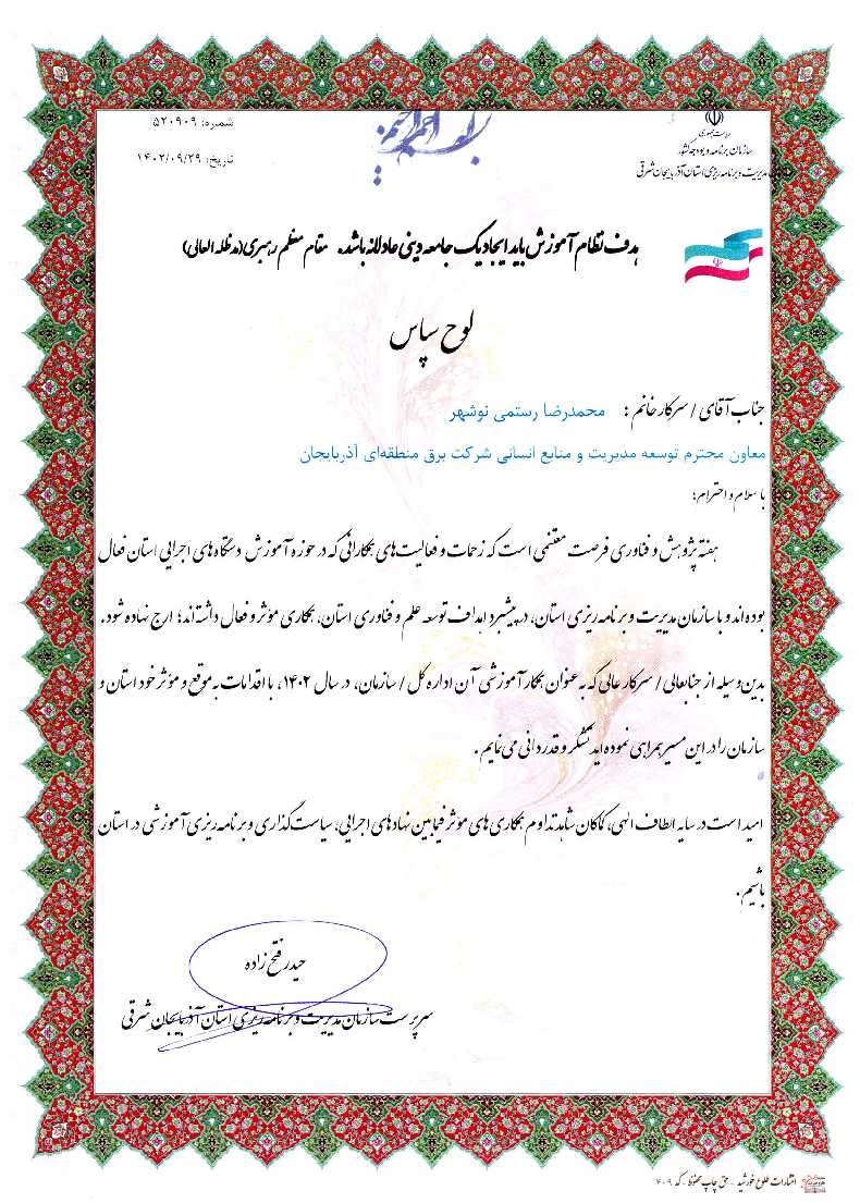 دکتر فتح زاده سرپرست سازمان مدیریت و برنامه ریزی استان آذربایجان شرقی با اهدای لوح تقدیر ازتلاشها و اقدامات به موقع معاون منابع انسانی شرکت برق منطقه ای آذربایجان در پیشبرد اهداف توسعه علم و فن آوری استان در سال 1402 تقدیرو تشکرکرد .