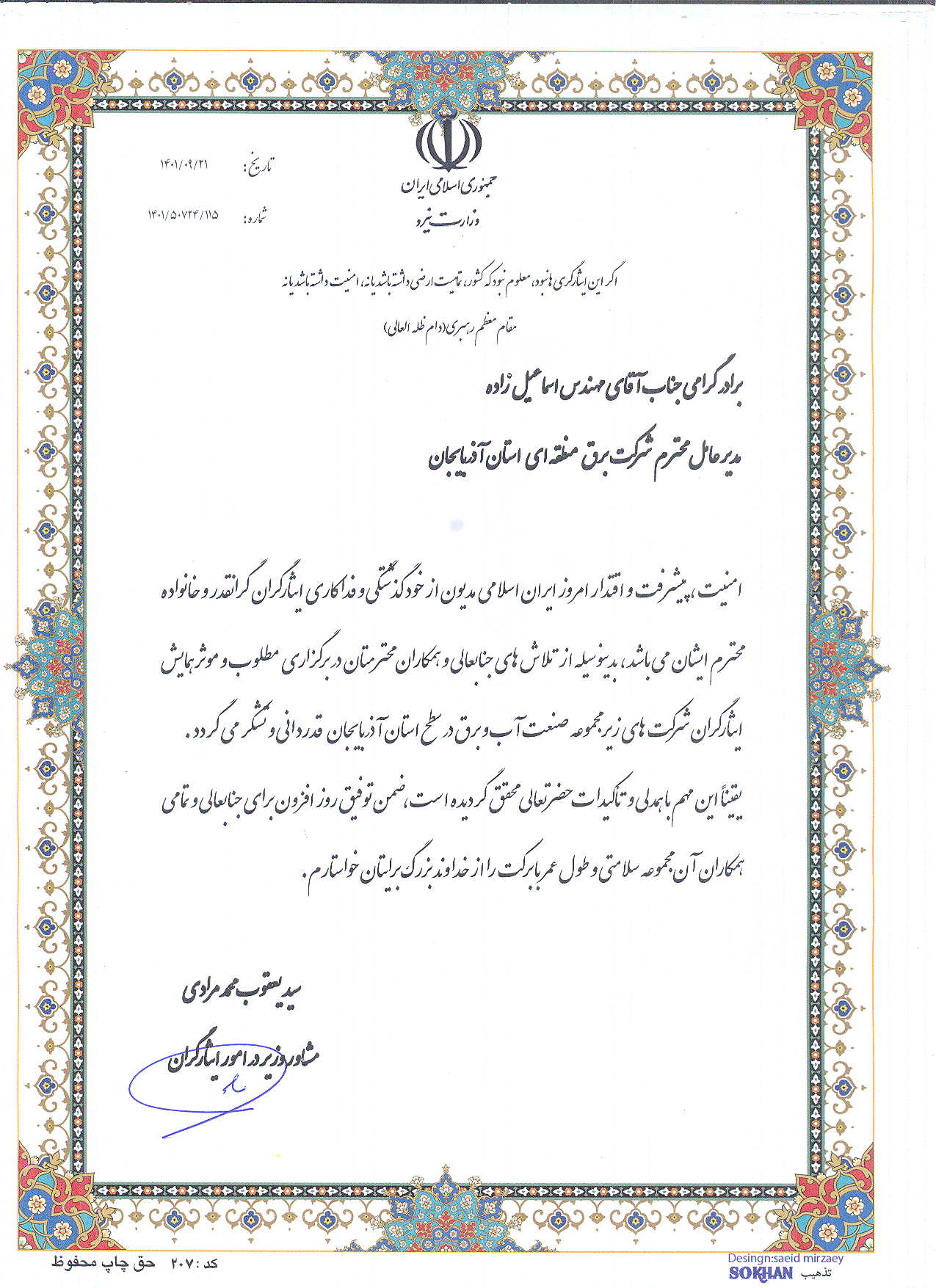 دکتر سید یعقوب محمد مرادی مشاور وزیر نیرو در امور ایثارگران با اعطای لوح تقدیر به دکتر رسول اسماعیل زاده مدیرعامل شرکت برق منطقه ای آذربایجان از همکاری ایشان و مجموعه شرکت در برگزاری مطلوب و موثرهمایش ایثارگران شرکت های زیر مجموعه صنعت آب و برق در سطح استان آذربایجان تقدیر و تشکر کرد.