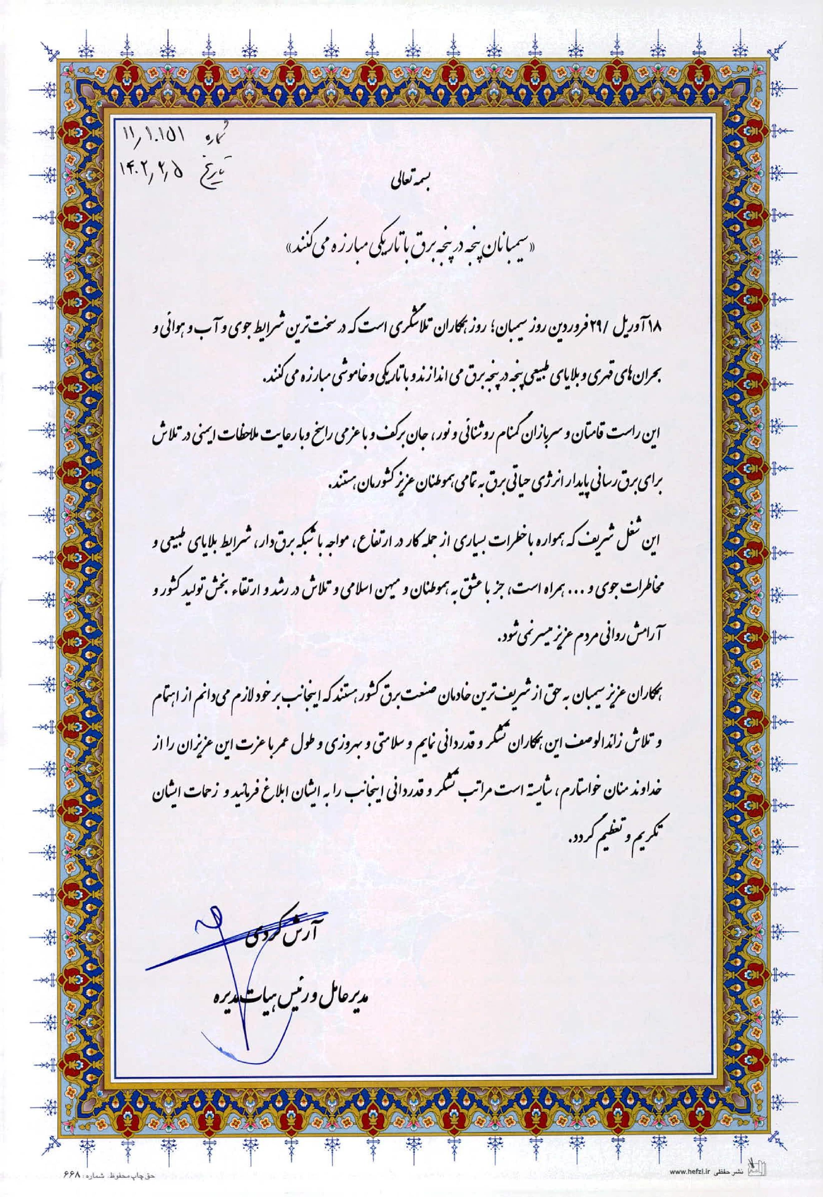مهندس آرش کردی مدیرعامل شرکت توانیربه مناسبت 29 فروردین( روز سیمبان ) با اهدای لوحی از تلاشگری سیمبانان صنعت برق کشور که در سخت ترین شرایط جوی و آب وهوائی و بحران های قهری وبلایای طبیعی پنجه در پنجه برق می اندازند و با خاموشی وتاریکی مبارزه می کنند تقدیر وتشکرکرد.