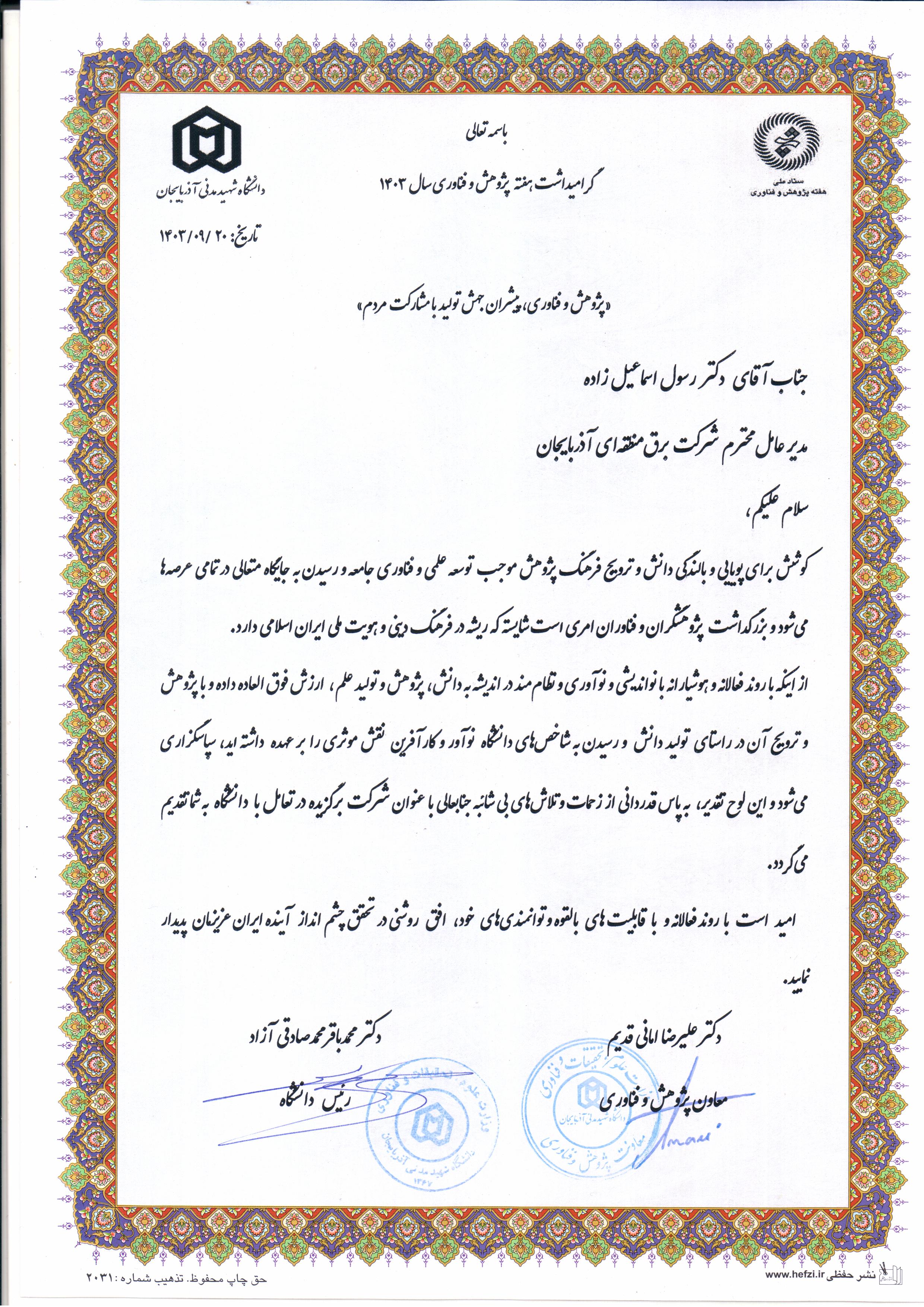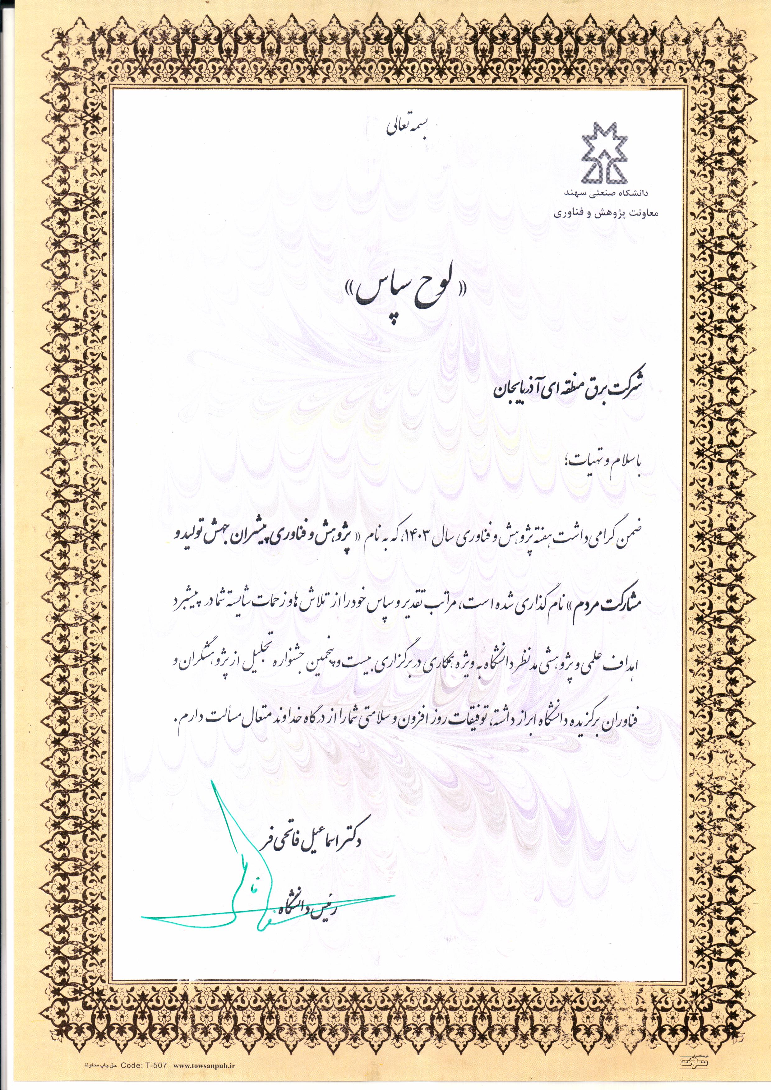 در این لوحهای تقدیر با اشاره به اینکه بزرگداشت پژوهشگران و فناوران امری شایسته میباشد، خطاب به مدیرعامل شرکت برق منطقهای آذربایجان آمده است: