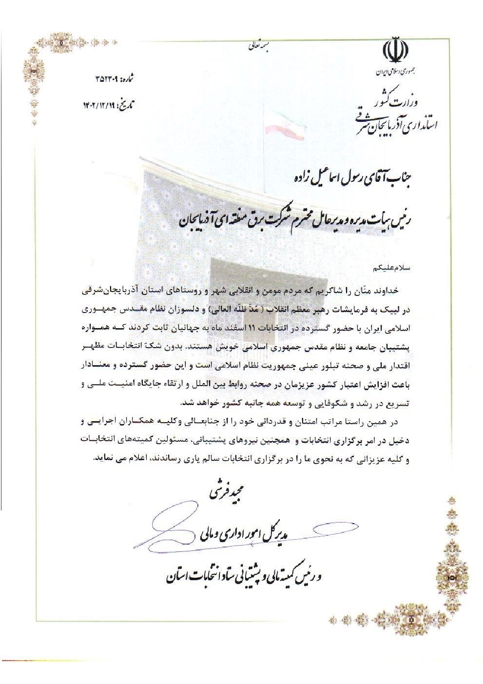 آقای مجید فرشی مدیر کل امور اداری و مالی استانداری آذربایجان شرقی و رئیس کمیته مالی و پشتیبانی ستاد انتخابات استان، با اعطای لوح تقدیر به دکتر رسول اسماعیلزاده مدیرعامل شرکت برق منطقهای آذربایجان، مراتب تقدیر و تشکر صمیمانه خود را از وی و کلیه همکاران اجرایی و دخیل در امر برگزاری انتخابات ۱۱ اسفند ماه دوازدهمین دوره مجلس شورای اسلامی و ششمین دوره مجلس خبرگان رهبری اعلام نموده است.