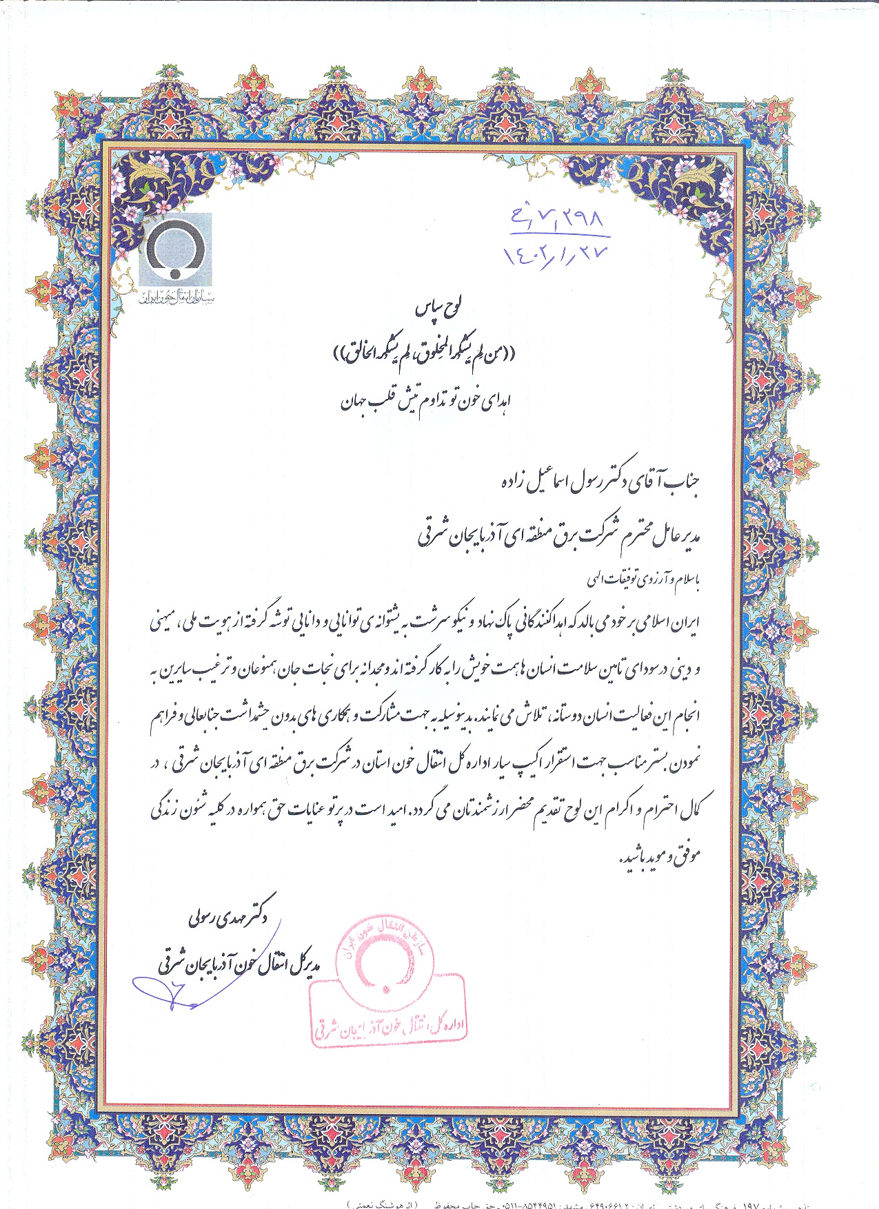دکتر مهدی رسولی مدیرکل انتقال خون آذربایجان شرقی با اعطای لوح سپاس، از دکتر رسول اسماعیل زاده مدیر عامل شرکت برق منطقه ی آذربایجان قدردانی کرده است. مدیرکل انتقال خون آذربایجان شرقی در این لوح سپاس، از مشارکت و همکاری های مدیر عامل برق منطقه ای آذربایجان با انتقال خون استان و فراهم نمودن بستر مناسب جهت استقرار اکیپ سیار این اداره کل و نیز از همکاران نوعدوست اهدا کننده خون، صمیمانه قدردانی کرده است.
