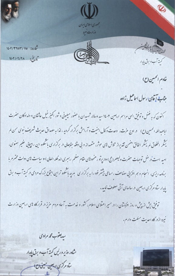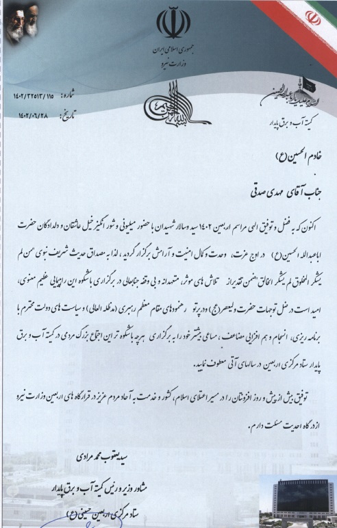 وی در این لوحهای تقدیر، از تلاشهای موثر، متعهدانه و بیوقفه مدیرعامل و همچنین همکاران مان آقایان خلیل مقدسی، جعفر رشادت و مهدی صدقی در برگزاری باشکوه راهپیمای عظیم معنوی مراسم اربعین ۱۴۰۲ سید و سالار شهیدان حضرت اباعبدالله الحسین (ع) و خدمت بیشائبه به آحاد مردم عزیز کشورمان در قرارگاههای اربعین وزارت نیرو صمیمانه تقدیر و تشکر نموده است.