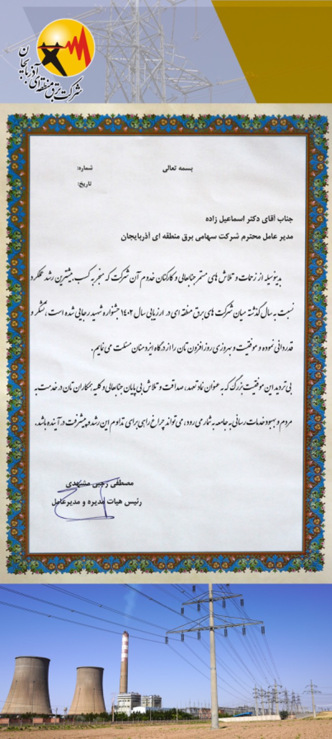 مدیرعامل شرکت توانیر در این لوح تقدیر، از زحمات و تلاشهای مستمر مدیرعامل و تک تک مدیران و کارکنان خدوم شرکت برق منطقه ای آذربایجان قدردانی نموده و خطاب به مدیرعامل این شرکت اظهار داشته است که بدون تردید، این موفقیت بزرگ که به عنوان نماد تعهد، صداقت و تلاش بیپایان جنابعالی و کلیه همکارانتان در خدمت به مردم و بهبود خدمات رسانی به جامعه به شمار میرود، میتواند چراغ راهی برای تداوم این رشد و پیشرفت در آینده باشد.