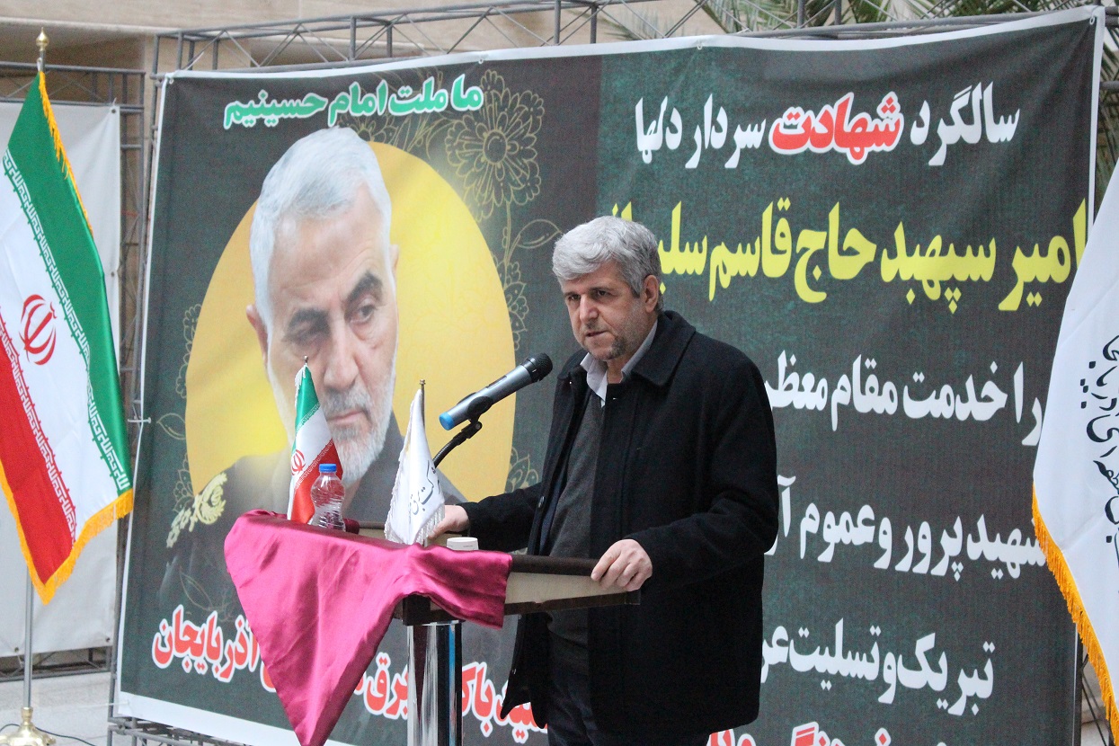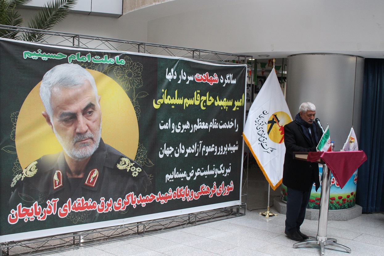 سومین سالگرد شهادت سردار سپهبد شهید حاج قاسم سلیمانی با برگزاری مراسمی در شرکت برق منطقه ای آذربایجان گرامی داشته شد. در این مراسم که از سوی شورای فرهنگی شرکت برق منطقه ای آذربایجان و با حضور حداکثری کارکنان این شرکت ترتیب یافت ابتدا محمدرضا رستمی نوشهر فرمانده پایگاه مقاومت شهید حمید باکری برق منطقه ای آذربایجان ضمن تسلیت ایام گرامیداشت سالگرد شهادت سردار سلیمانی، به مهمانان و حاضرین در مراسم ، به بیان فضایل اخلاقی وفلسفه شهادت شهید سلیمانی پرداخت.
