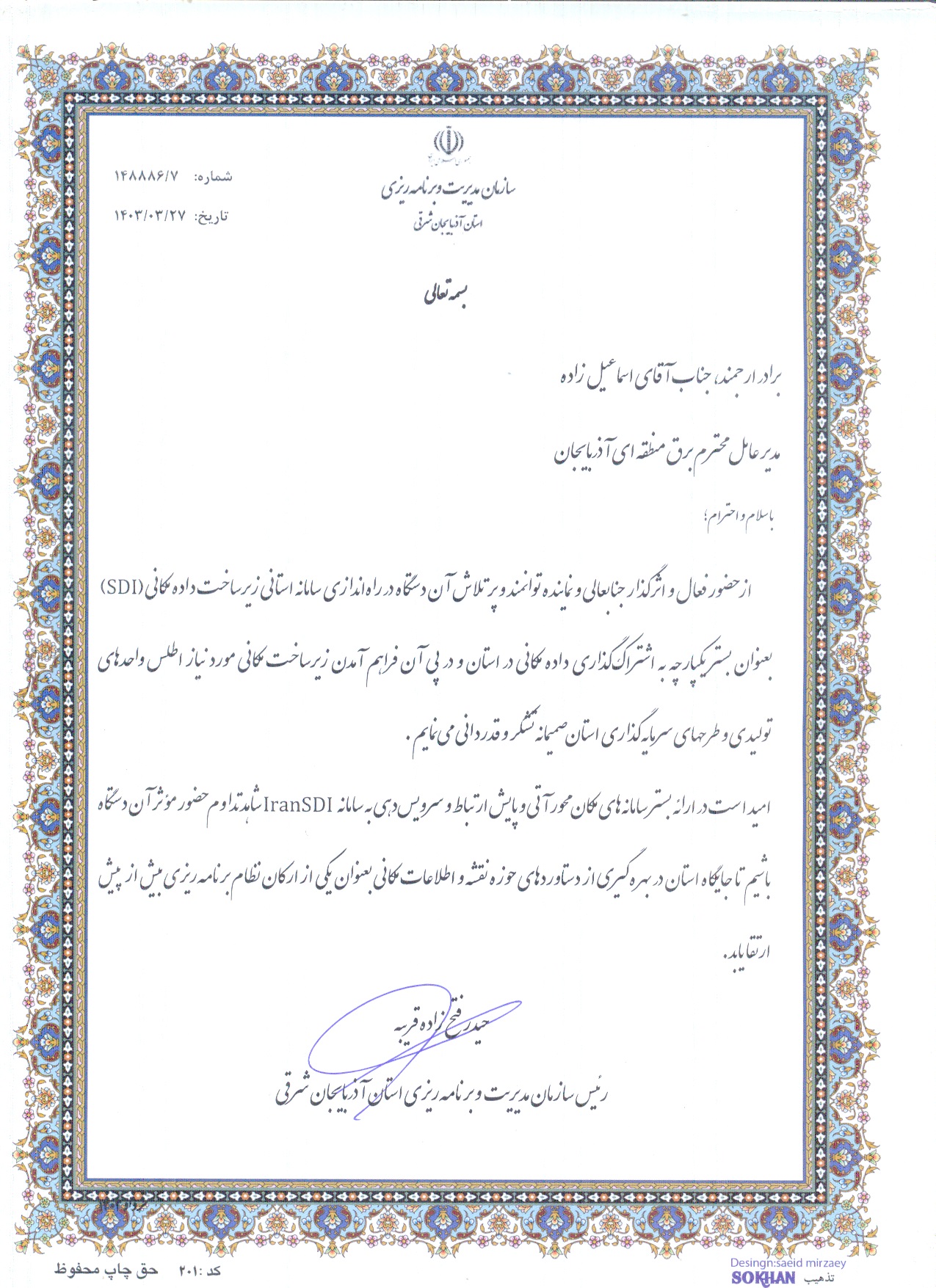 رئیس سازمان مدیریت و برنامهریزی آذربایجان شرقی در این لوح تقدیر همچنین اظهار امیدواری کرده است که در ارائه بستر سامانههای "مکان محور" آتی و پایش ارتباط و سرویس دهی به سامانه ایران IranSDI شاهد تداوم حضور موثر شرکت برق منطقهای آذربایجان باشند تا جایگاه استان در بهرهگیری از دستاوردهای حوزه نقشه و اطلاعات مکانی به عنوان یکی از ارکان نظام برنامهریزی بیش از پیش ارتقا یابد.