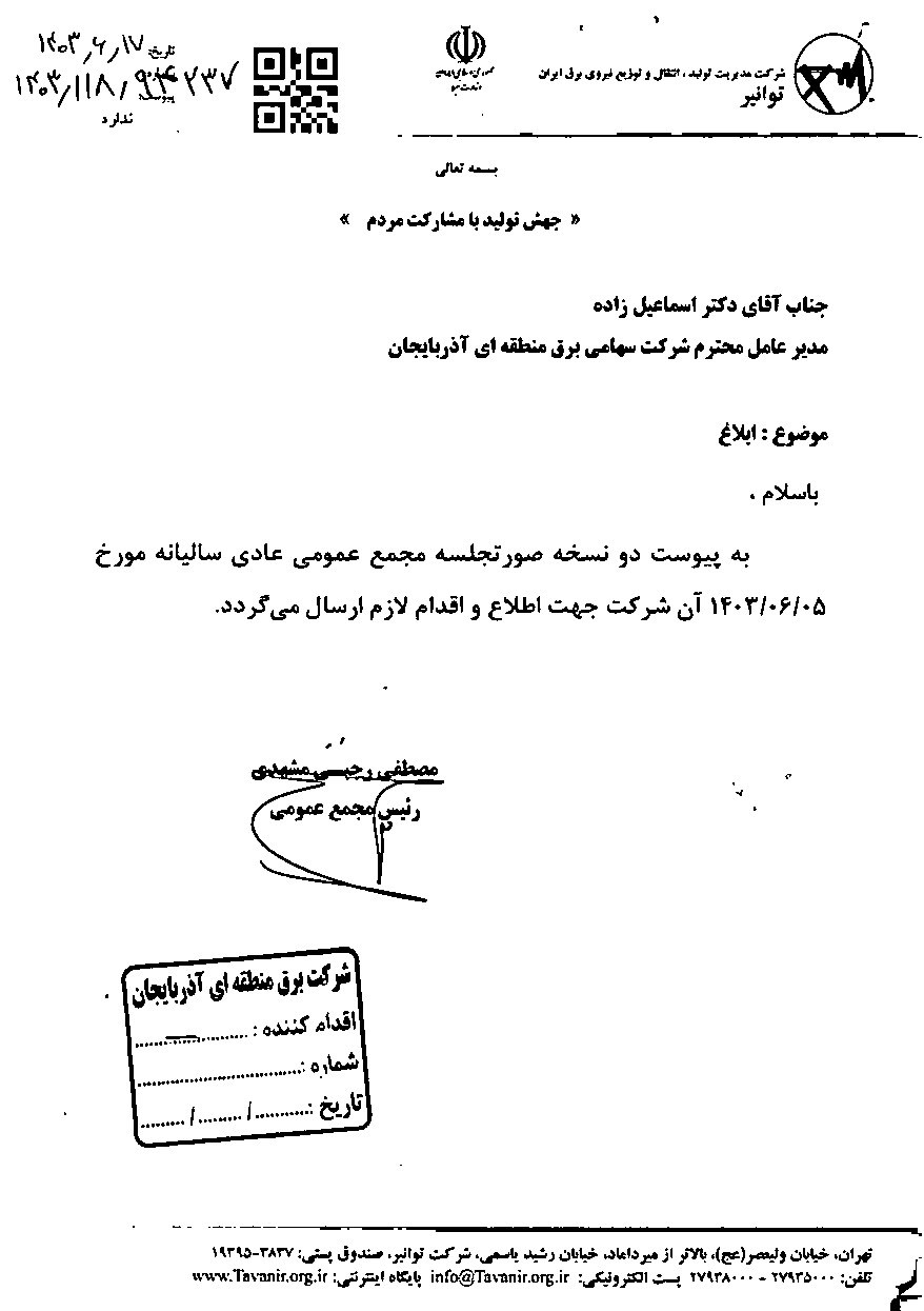 ابلاغ دو نسخه صورتجلسه مجمع عمومی عادی سالیانه مورخ 1403/06/05