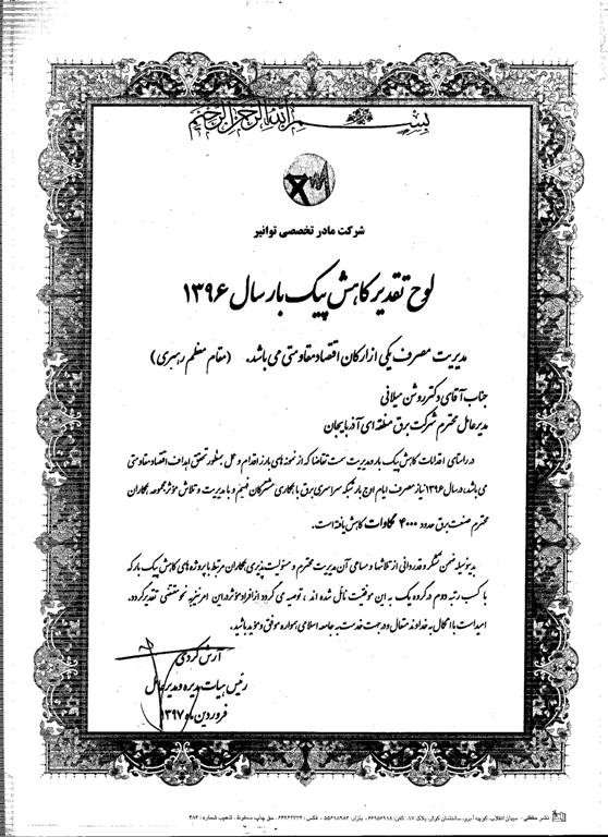 در همین خصوص مهندس آرش کردی مدیر عامل شرکت مادر تخصصی توانیر با عطای لوح تقدیر خطاب به دکتر میلانی مدیر عامل شرکت برق منطقهای آذربایجان از اقدامات موثر این شرکت در مدیریت و کاهش پیک بار بویژه ازهمکاریهای مشترکین فهیم و تلاش مجموعه همکاران موثر درا ین امر، صمیمانه تقدیر و تشکر نموده و آن را نمونه بارز اقدام و عمل به منظور تحقق اهداف اقتصاد مقاومتی در سال ۹۶ دانسته است.