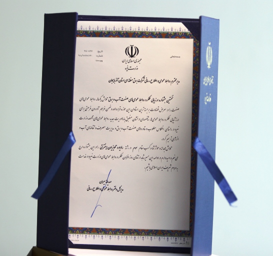 کسب رتبه سوم روابط عمومی آب وبرق کشور توسط روابط عمومی برق منطقه ای آذربایجان و دریافت تندیس بلورین از دست وزیر نیرو