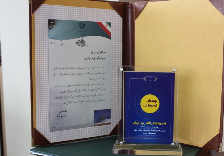 در مراسمی که با رعایت پروتکل های بهداشتی پیش از ظهر روز سه شنبه دوم دیماه ،در محل شرکت آب منطقه ای آذربایجان شرقی با حضور جمعی از مسئولین استانداری و مدیران عامل صنعت آب و برق آذربایجان شرقی ترتیب یافت ، این لوح تقدیر به همراه تندیسی تحت عنوان " وعده ای که وفا شد " مزین به بیانات رهبر معظم انقلاب و ریاست محترم جمهوری در خصوص پویش مذکور ، به دکتر میلانی مدیرعامل شرکت برق منطقه ای آذربایجان اعطاء گردید.