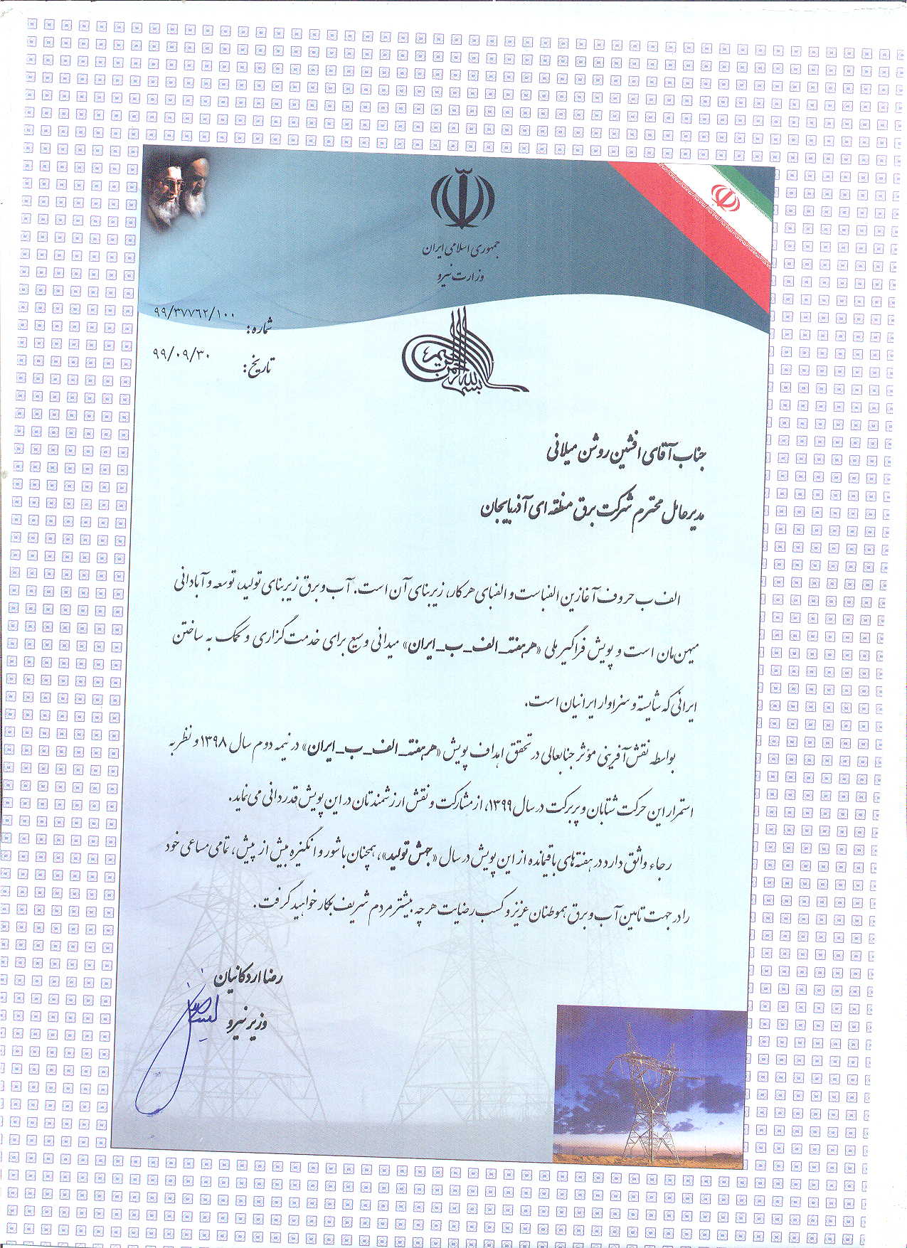 دکتر اردکانیان همچنین در این لوح ، از مشارکت و نقش آفرینی موثر و ارزشمند مدیرعامل شرکت برق منطقه ای آذربایجان در تحقق اهداف پویش " #هرهفته-الف-ب- ایران" در نیمه دوم سال ۱۳۹۸ و استمرار این حرکت شتابان، در هفته های باقیمانده از پویش در سال" جهش تولید" تمام تلاش و مساعی خود را در جهت تامین آب وبرق هموطنان عزیز و کسب رضایت هرچه بیشتر مردم شریف به کار خواهند گرفت.