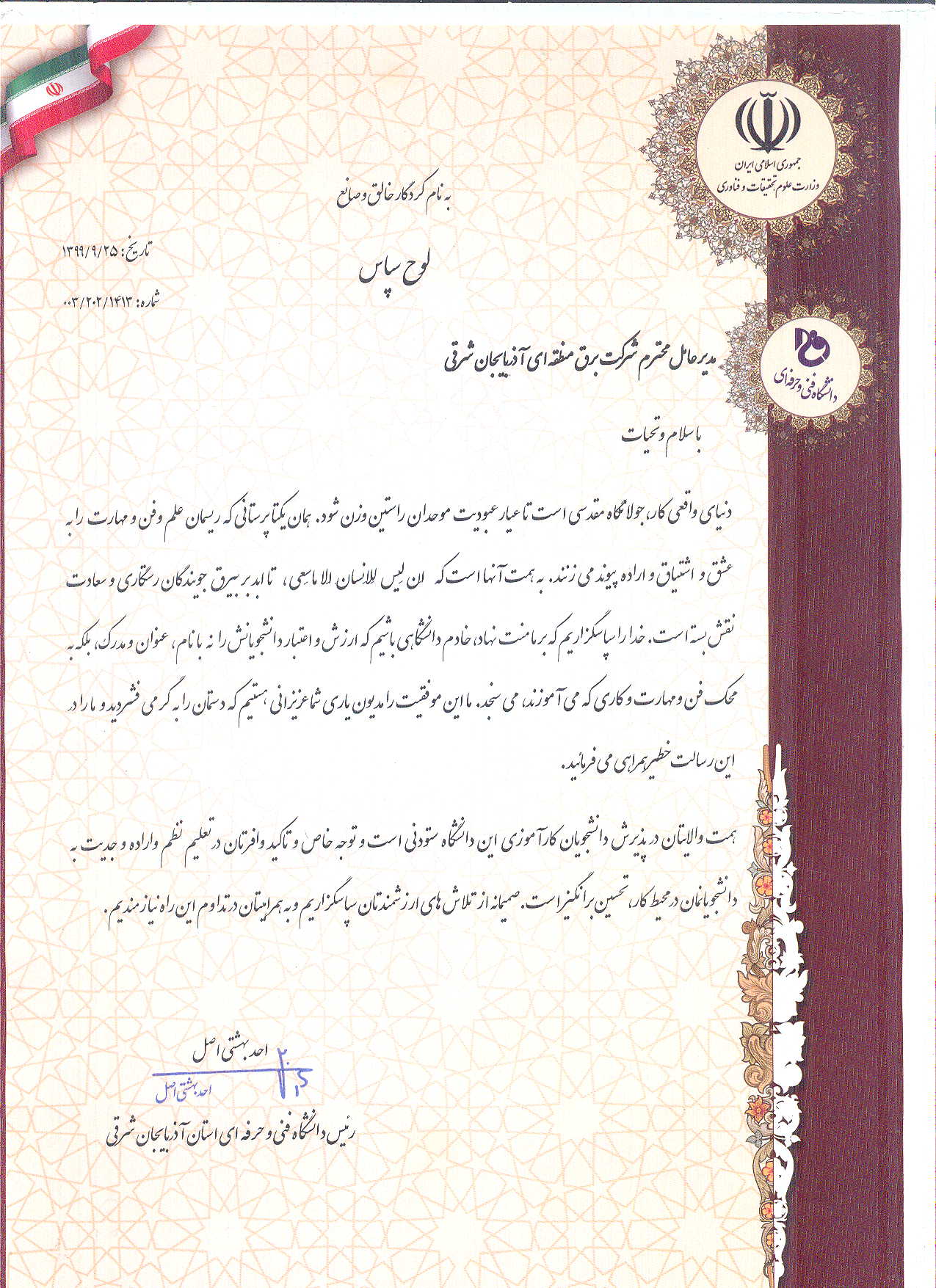 قدردانی رئیس دانشگاه فنی و حرفهای استان آذربایجان شرقی از مدیرعامل شرکت برق منطقه ای آذربایجان