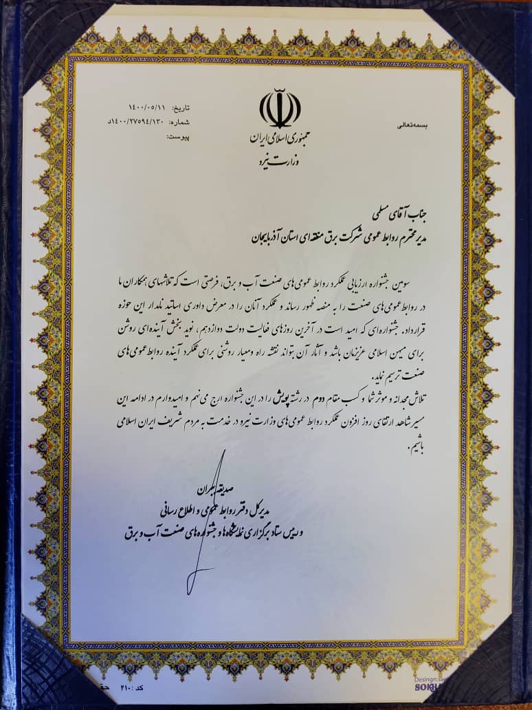 روابط عمومی شرکت برق منطقه ای آذربایجان در سومین جشنواره ارزیابی روابط عمومیهای صنعت آب و برق کشور در دو رشته "مدیریت و برنامه ریزی" و "#پویش هر هفته الف_ب_ایران" مقام دوم را کسب کرد.