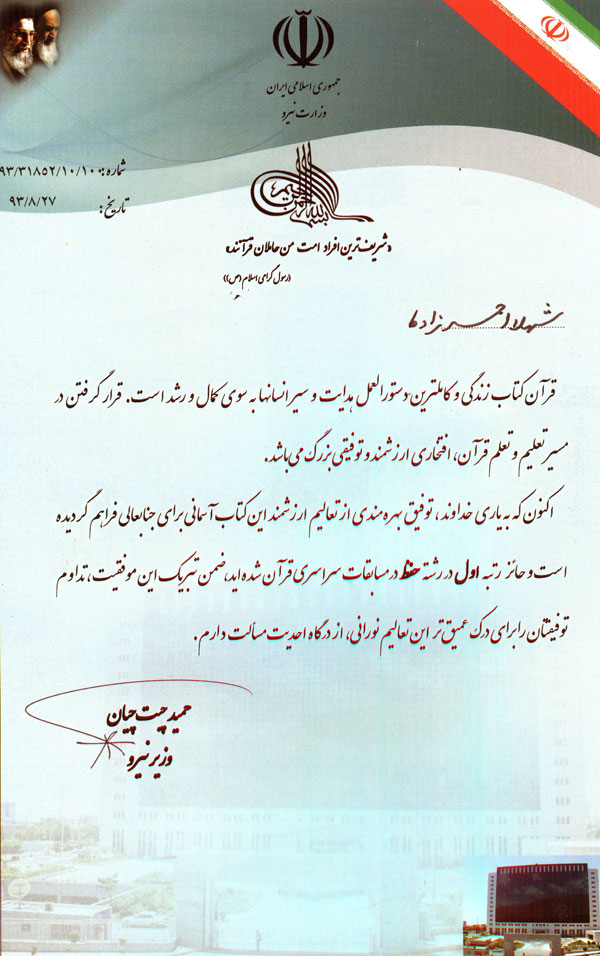 شایان ذکر است مرحله نهایی دهمین دوره مسابقات قرآنی کریم وزارت نیرو ۲۸ آبان ماه گذشته در مشهد مقدس برگزار شد و گروه قرآنی شرکت برق منطقه ای آذربایجان نیز موفق به کسب مقام سوم این مسابقات گردید.